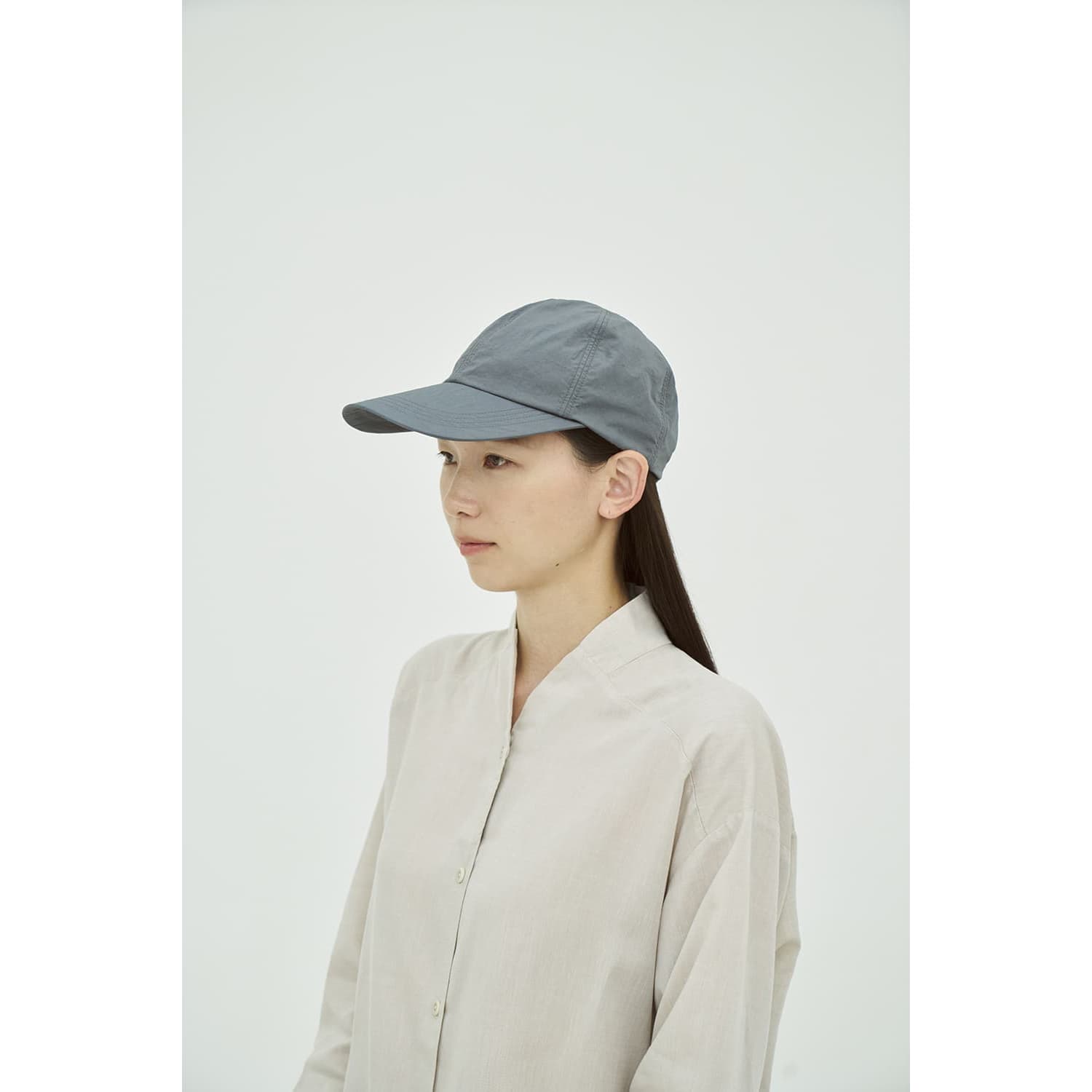 撥水ナイロンを使用したロングバイザーキャップ。程よい深さのクラウンに、長めのつばを合わせ遮光性を高め、シャープなシルエットに仕上げました。