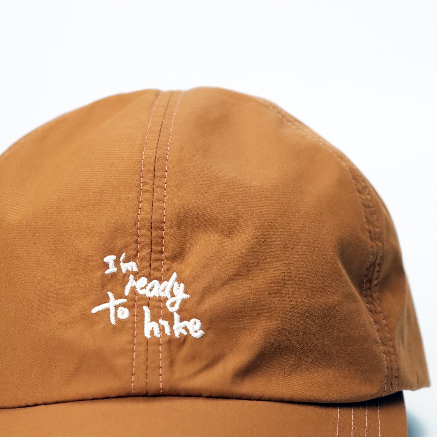 コットンのような肌触りと通気性に加え、耐久性・撥水性を兼ね備えたコットンナイロンキャップ。フロントには「I’m ready to hike」の刺繍をあしらい、日常使いからアウトドアまで気分を高めてくれるアクセントになっています。