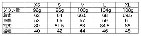 ダウン量 XS 92g / S 96g / M 100g / L 104g / XL 108g
