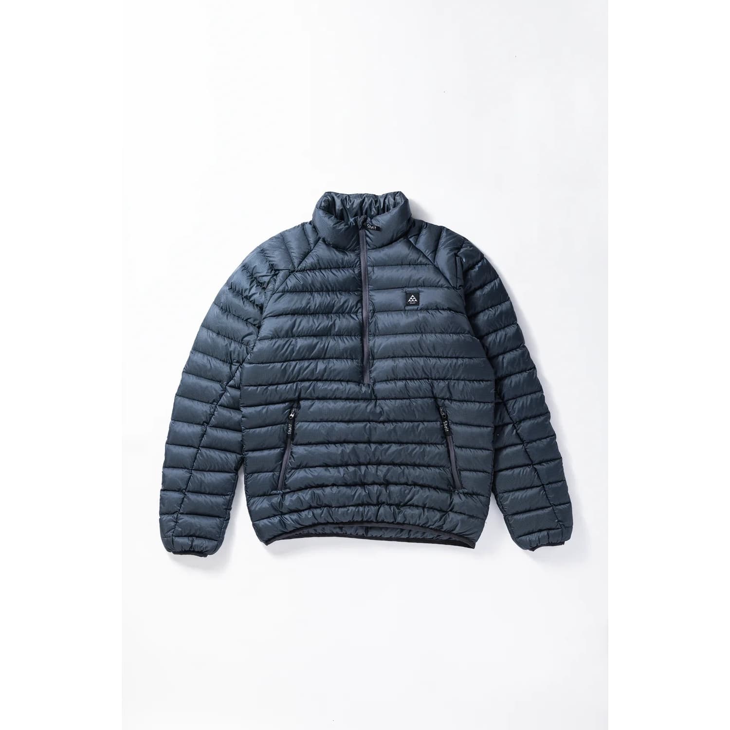 SheltオリジナルのDown Pulloverは、襟・裾にコードを入れず程よいストレッチパイピングを使用にすることで軽量化を図りつつ、ダウン量を増やし暖かさを確保しました。